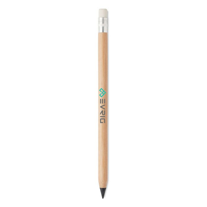 Long-lasting bamboo inkless pen with bamboo barrel and eraser on top with paper cap.